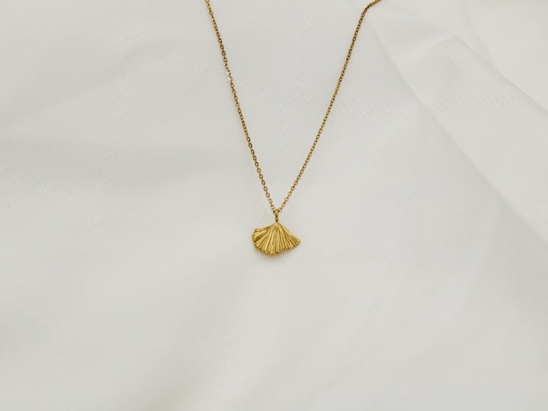 Denne forgyldte halskæde er et smukt og feminint smykke, der kombinerer minimalistisk elegance med et tidløst design. Den meget fine og tynde kæde giver et feminint udtryk kombineret med det smukke vedhæng formet som en vifte eller et blad, som giver halskæden et unikt og delikat udseende, der passer perfekt til enhver lejlighed – et smykke med delikat elegance.