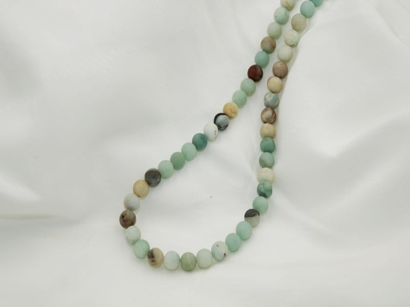 Denne forgyldte halskæde er en hyldest til amazonitens mangfoldige farver og naturlige skønhed. Hver perle er et kunstværk i sig selv, med sin egen unikke farvekombination og mønster. Sammen skaber de en halskæde, der er både iøjnefaldende og elegant. Et smykker, der er lige så unikt som naturen selv.
