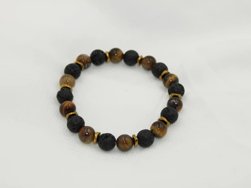 Armbånd er med ekstra stærk elastik og 8 mm gule tigerøje og sort lava ædelsten. Der er forgyldte hæmatit mellemled.