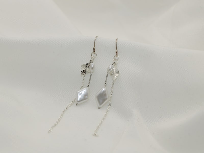 Disse smukke, lange ørekroge er et tidløst stykke smykkekunst, der kombinerer elegance og modernitet. Den forsølvet ørekrog og de elegante hvide shellperler formet som harlekin mønster giver en kontrastfuld og iøjnefaldende kombination, som fuldendes af det fine harlekin mønster og forsølvet kæde vedhæng.
