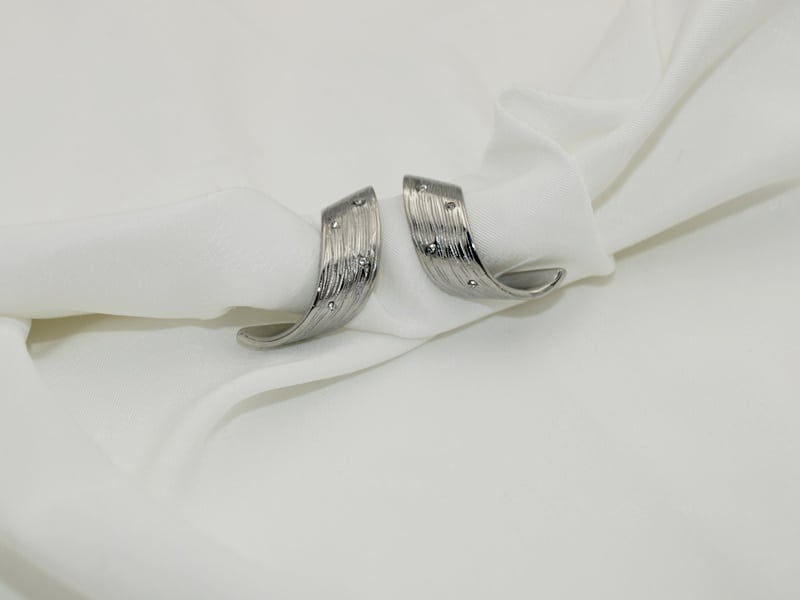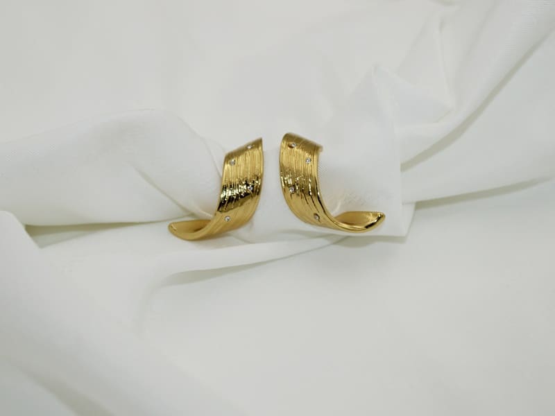 Disse flotte og unikke ørestikker forener enkelhed med et unikt design. Den stilrene snoede form er smukt udført i forgyldt materiale med riller overflade og små zirkoniasten, hvilket giver et sofistikeret og tidløst udtryk. Ørestikkernes minimalistiske design gør dem lette at kombinere med andre smykker og ideelle til dig, der værdsætter diskret elegance.